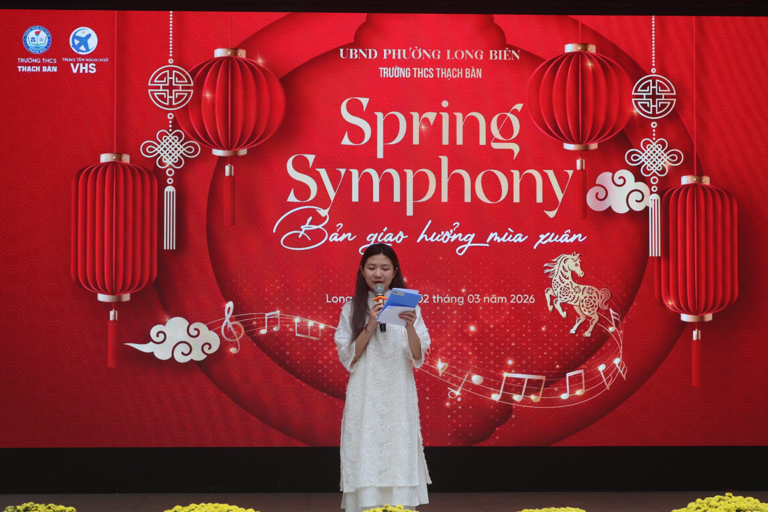 Sáng ngày 02/03/2026 vừa qua, sân trường THCS Thạch Bàn đã trở nên sôi động hơn bao giờ hết với chương trình “SPRING SYMPHONY 2026 – BẢN GIAO HƯỞNG MÙA XUÂN”. Đây là món quà đặc biệt mà Trung tâm Ngoại ngữ VHS phối hợp cùng nhà trường dành tặng cho các bạn học sinh.